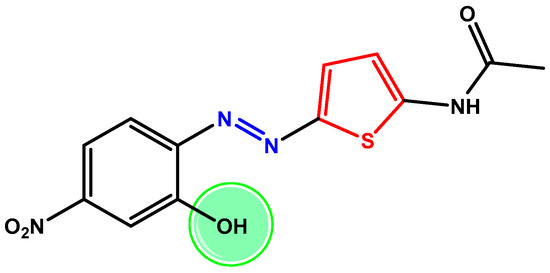 In 15 mL of water and 37% hydrochloric acid (1:1), 3.5 mg of 2-acetamide thiophene [26] was suspended, and the suspension was kept at 4 °C in an ice-water bath. Simultaneously, 5.0 g of diazonium salt of 2-amino-5-nitrophenol was dissolved in 40 mL of ethanol and then dropped into the 2-acetamide thiophene suspension. The suspension was allowed to react under stirring for about 60 min, and then the product was precipitated by pouring the reaction solution into water and ice. The product was recovered by filtration and washed with water, resulting in a dark red solid. The solid was then crystallized from acetone/hexane into red crystals. Yield: 85%. 1H NMR (DMSO-d6; 400 MHz) δ: 2.16 (s, 3H), 6.81 (d, 1H, J = 4.5), 7.62 (d, 1H, J = 8.8), 7.70 (d, 1H, J = 9.4), 7.76 (s, 1H), 7.84 (d, 1H, J = 4.5) (Hard copies of 1H-NMR and 13C NMR are reported in Supplementary Materials, Figures S1 and S2). MS (m/z) 306.04, found [M-H]–: 305.03. (Hard copy in Figure S3).