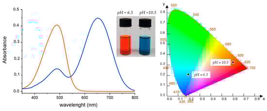 Experimental UV-vis absorption spectra in buffered acetone solutions at pH = 6.5 (orange line) and pH = 10.5 (blue line), pictures of the solutions (inset), and CIE diagrams for TA-OH, data collected at different pH values, are reported.