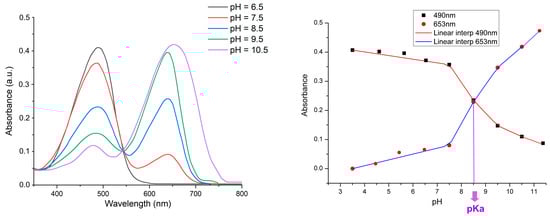 Experimental UV-vis absorption spectral titration data of TA-OH in buffered acetone/water solution, using Britton-Robinson buffer. On the left: absorbance curves in the most significant pH range (from 6.5 to 10.5). On the right: spectral determination of pKa from the absorbance data. from pH = 3.5 to pH = 11.5.