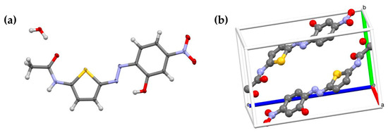 The single crystal structure of TA-OH was determined to visualize the main conjugation plane and to support theoretical assumptions. The analysis reveals a linear molecule with a central core around the thiophene group that is overall planar and has a bent shape (Figure 4). The core’s flat shape results from the electronic conjugation of the aromatic rings involved. The N=N bond on the thiophene ring adopts an E geometry and exhibits a mutual syn arrangement. Only very slight deviations are observed for the terminal nitro and acetyl groups with respect to the phenyl ring and the N=N bond. The crystal packing is stabilized by intermolecular Van der Waals interactions and self-assembled into π-stacked columns along the crystal a-b diagonal and arranged around the center of symmetry. A water molecule was identified in the crystal packing. Refinement parameters are summarized in Table 3.