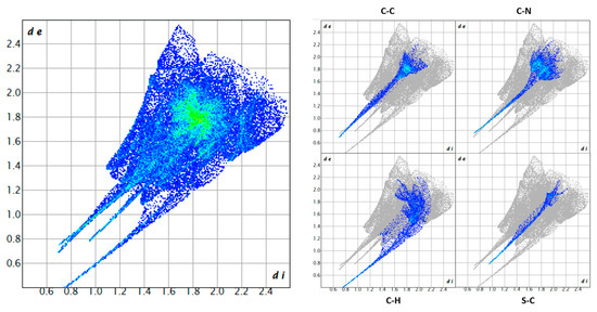 In the crystal, there is a predominance of antiparallel slipped face-to-face contact points between molecules. This is clearly evident in the plots in Figure 6, showing a green area centered at di + de = 3.6 Å. There are several edge-to-face contacts, and those visible in the “wings” are mainly due to carbon to carbon, nitrogen, and hydrogen (contributing to the total contacts for C-C 11.4%, C-N 16.1%, and C-H 13.0%, respectively). The closest contacts are at 1.3 Å. The sulfur atom is getting as close as 1.7 Å to a carbon atom (contributing only 5.2% to the total contacts), as shown in Figure 6, bottom right.