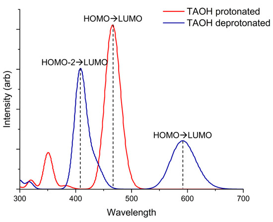 Simulated absorption spectra of TA-OH protonated (red line) and TA-OH deprotonated (blue line) using TD-DFT/TDA method in acetone solvent.