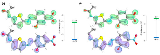 In Table S1 (Supplementary Materials), a detailed breakdown of electronic orbitals within the TA-OH protonated and deprotonated systems, their occupation status, and their associated energy values in atomic units (Eh) and electron volts (eV) are reported. In Figure 8a,b, the HOMO and LUMO orbitals of TA-OH in both protonated and unprotonated forms are reported. The deprotonated form exhibits a substantial elevation in the energy of the HOMO, consequently resulting in a pronounced bathochromic shift.