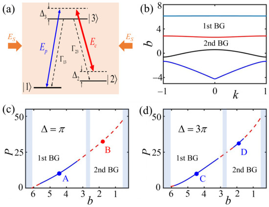 (a) Excitation scheme of the -type three-level atomic system in an optical lattice induced by two counter-propagating far-detuned laser fields (see the brown arrows). The other physical parameters are described in the main text. (b) The relevant linear band-gap spectrum of the corresponding optical lattice with . The 1st BG and 2nd BG represent the first and second band gaps, respectively. (c,d) represent the power P of equal-height type [or (1, 1, 1, 1)-type] localized gap modes versus propagation constant b with spatial distance and , respectively. Stability and instability regions for gap soliton clusters in panels (c,d) are respectively marked by blue solid and red dashed lines. The profiles of gap soliton clusters marked by points (A, B) and (C, D) whose corresponding propagation constants b are (4.5, 1.9) and (4.5, 1.9) will be depicted below.