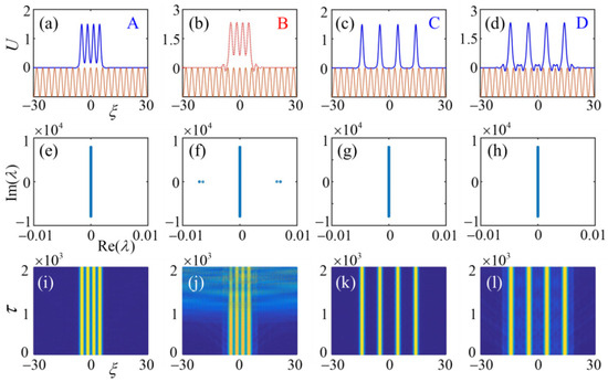 The simplest type of soliton clusters consists of identical solitons with equal height. For convenience, the structures of identical solitons are called (1, 1, 1, 1)-type solitons, where all branches of U are located on the upper-half plane of (, U). The adjacent distance between the identical solitons is adjustable and tuned to an integer that is a multiple of the lattice period that is set to for the given optical lattice with . After performing a great many numerical simulations, we identify the stability regions, expressed by power P versus propagation constant b, of such gap soliton clusters with two different spatial distances and in Figure 1c,d, demonstrating the instability of soliton clusters near the edge of finite gaps and that the former case is always unstable when being created in the second finite gap, although the stability region for the latter contracts sharply. Note that the stability and instability regions for (1, 1, 1, 1)-type gap soliton clusters in Figure 1c,d are, respectively, marked by blue solid and red dashed lines. The shapes of the stable and unstable (1, 1, 1, 1)-type gap soliton clusters (labeled by A and B in Figure 1c) are shown in Figure 2a,b by simulating Equation (2) via MSOM, which resemble a novel type of gap mode called gap waves or truncated nonlinear Bloch waves [22,68,69,70]. Increasing the adjacent distance , as depicted in Figure 2c,d (labeled by C and D in Figure 1d), each soliton of the gap soliton clusters could be considered as a fundamental gap soliton, and the interaction or tunneling between each soliton becomes weak. The orange solid lines in Figure 2a–d denote the shape of the optical lattice. The middle line of Figure 2 depicts the eigenvalue spectra of these four gap soliton clusters obtained by means of linear stability analysis via solving the eigenvalue problem (Equation (3)). We show that of the second mode (Figure 2b) with , and is nonzero, which indicates the mode is unstable. Meanwhile, the other modes (Figure 2a,c,d) are stable due to their corresponding real parts of eigenvalue being zero. We then turn to utilize the direct perturbed simulation to integrate Equation (1) for investigating the dynamical propagation of gap modes. The results displayed in the bottom line of Figure 2 are identical to the eigenvalue problem. Particularly, the unstable one in Figure 2j diverges and oscillates, and the stable ones in Figure 2i,k,l keep their shapes unchanged in the course of evolution.