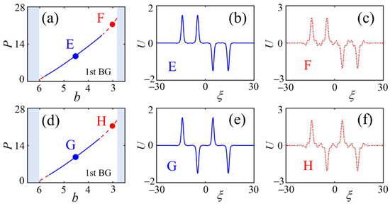 (a,d), respectively, represent the power P of (1, 1, −1, −1)-type and (1, −1, 1, −1)-type localized gap modes versus propagation constant b with spatial distance in the first finite gap. (b,e) and (c,f) are, respectively, the corresponding profiles of the marked points (E, G) and (F, H) by simulating Equation (2) via MSOM. Note that the blue solid and red dashed lines in all panels, respectively, indicate the stable and unstable dipole-type gap soliton clusters modes.