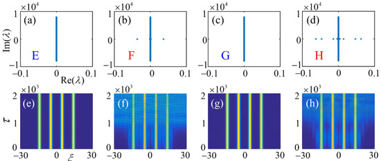 We emphasize that the stable dipole-type gap soliton clusters of both forms could only be prepared within the first finite gap of the underlying linear Bloch spectra, compared to their equal-height type in Figure 1d where the existence of stable gap soliton clusters is also within the second finite gap. In the top line of Figure 4, we have shown the corresponding linear stability eigenvalue spectra of these four soliton clusters. The real parts of the eigenvalue, i.e., , for stable gap modes of marked points (E, G) with are zero, while for unstable gap modes of marked points (F, H) with , they are nonzero. Utilizing the direct perturbed simulation to integrate Equation (1), the evolutional dynamical propagation of the corresponding gap modes is depicted in the bottom line of Figure 4, where it is seen that an agreement is once again made between the both. For stable gap soliton clusters, their shapes and amplitudes remain constant during a long-time evolution, while the unstable ones in Figure 4f,h diverge and oscillate, which behave as the equal-height type in Figure 2j.