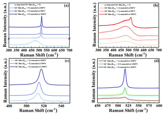 The Raman spectra of SiC films with RSi/C = 1 (a) and 5 (b) before and after annealing at 800 °C, 900 °C, and 1000 °C. (c) The Raman spectra of SiC films with RSi/C = 5 annealing at 800 °C, 900 °C, and 1000 °C and (d) The Raman spectra of SiC films with various RSi/C values annealed at 1000 °C.