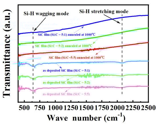 The FTIR spectra for SiC films with various Si/C ratios before and after annealing at 1000 °C.