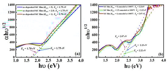 Measurements were conducted for the reflection and transmission of SiC films before and after thermal annealing in order to explore the optical performance of SiC films. The optical bandgap,, of SiC films with various Si/C ratios before and after annealing at 1000 °C can be deduced by using the Tauc plot as shown in Figure 3. The plots of versus photon energy in Figure 3a show that the optical bandgaps of as-deposited samples with various Si/C ratios were around 1.75 eV, representing the bandgaps of amorphous SiC films. As shown in Figure 3b, we noted that the optical bandgaps of SiC films after 1000 °C annealing were obviously increased, reaching about 2.10 eV with . It is generally believed that the structures of SiC films are changed from amorphous to nanocrystalline phases via thermal annealing. During crystallization, disordered grain boundary regions that have a higher optical gap than the amorphous SiC regions are gradually generated, thus contributing to the overall optical gap of the SiC films after annealing [25]. Therefore, the increase in the optical gap for the SiC films annealed at 1000 °C can be mainly ascribed to the increase in nanocrystalline components in the films. This can also explain the increase in the optical bandgaps with , which reached 2.23 eV in the SiC film with . Furthermore, the increase in the optical bandgap may also be caused by the incorporation of N or O into the annealed films during the annealing process, as usually observed in previous studies [26].