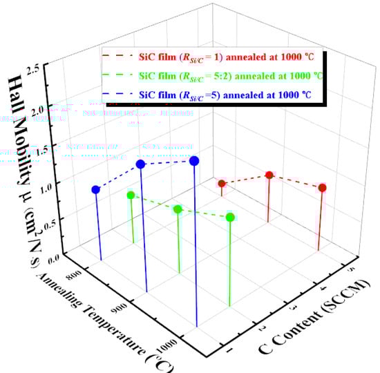 Room-temperature Hall mobility for the SiC films with various Si/C ratios annealed at different temperatures.