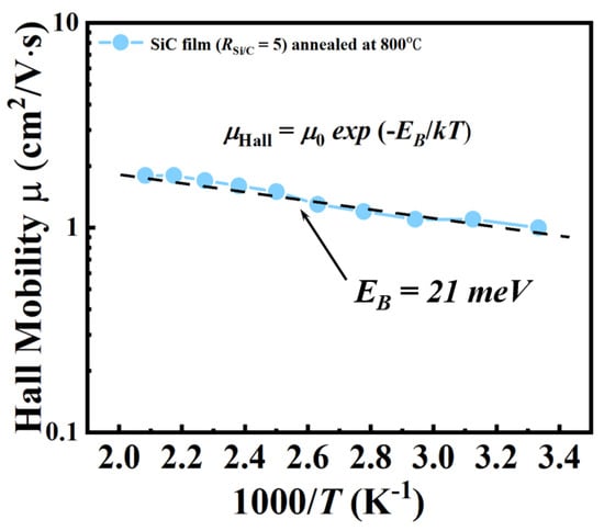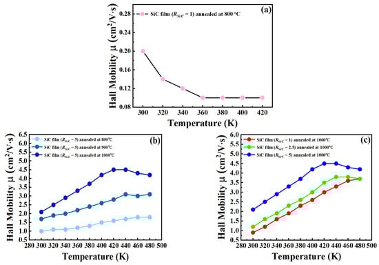 In order to deeply investigate the electronic properties of SiC films, especially the carrier transport behaviors, temperature-dependent Hall measurements in the SiC films with various values annealed at different temperatures were performed as shown in Figure 5a–c. It should be pointed out that Hall mobilities () as a function of test temperature (T) show different behaviors in different films. As shown in Figure 5a, the Hall mobility in the SiC film with annealed at 800 °C, which showed an extremely low value of 0.2 cm2/V∙s at room temperature, was slightly decreased with increasing test temperature. As mentioned above, we can approximate the SiC film with annealed at 800 °C as an a-SiC film. In amorphous thin films, the carrier Hall mobility is greatly limited due to the large number of defects, the presence of impurities, and the amorphous structure, which result in relatively low Hall mobility [27,28,29]. The Hall mobility of a-SiC films tends to decrease as temperature increases due to the greater scattering of charge carriers and the increased number of scattering centers within the film. This leads to a reduction in Hall mobility.