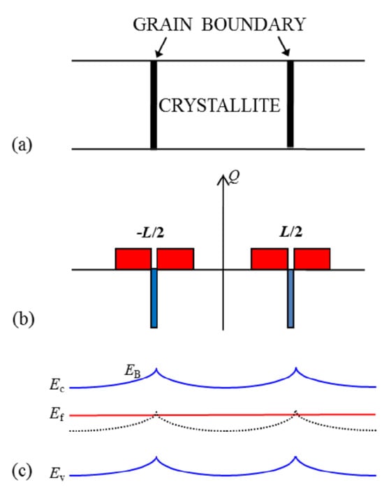 The band diagram of the Seto model (a) model for the crystal structure; (b) The charge distribution within the crystallite and at the grain boundary; (c) the energy band. Adapted from [30].