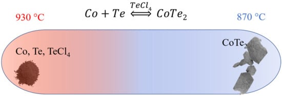 The CoTe2-δ single crystals are grown using a chemical vapor transport (CVT) method, which is very popular in the single crystal growth of quantum materials [69,70,71,72,73], as demonstrated in Figure 1. The chemical vapor transport summarizes a variety of reactions that show one common feature: a solid-state material is volatilized in the presence of a gaseous reactant, the transport agent, and deposits elsewhere, usually in the form of single crystals. Usually, the chemical reactions happen in a closed environment, which relies on a suitable transport agent and the experimental condition. Therefore, it is a prerequisite for a transport effect in which the transport agent reacts with the source material with the formation of one or more gaseous compounds. In this case, halogens or halogen compounds are usually used as transport agents. Due to the chemical reaction that happens at the interface of solid and gas states, a relatively lower temperature condition is employed more than other crystal methods. Therefore, the CVT method shows significant advantage in high-melting-point crystal growth. In this experiment, we chose TeCl4 as the transport agent. Briefly, high-purity Co (99.9%) and Te (99.99%) powders in a 1:2 molar ratio (~1 g in total) are sealed in a silica tube in a high vacuum, together with 5 mg/mL of TeCl4 as transport agent. The actual transport agent’s mass (TeCl4) was calculated based on the volume of the sealed silica tube.