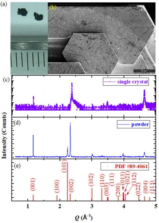 There are three different types of CoTe2 that were investigated, namely trigonal CoTe2, cubic CoTe2, and orthorhombic CoTe2. The single-crystal XRD pattern taken from a freshly cleaved sample surface verifies the trigonal phase, as shown in Figure 2. Thus, the obtained single crystals are hexagonal thin plates, as demonstrated in Figure 2b. Trigonal CoTe2-δ crystallizes in a LiTiS2-type structure (space group ), which has a typical van der Waals layered structure, and can be exfoliated along the c axis [55,57,67,68]. The cleavage faces in CoTe2 is therefore verified as c surfaces, as indicated by the sharp (00l) patterns in Figure 2c. The powder XRD patterns of CoTe2-δ is shown in Figure 2d. The peak intensity ratio between (101) and (002) shows a preferred orientation in the prepared powder sample, which is due to the 2D crystal structure. The standard diffraction results in the PDF card #89-4061 are plotted in Figure 2e with clear indices. Due to the different X-ray source materials used in the current experiments and PDF card, was employed in Figure 2. Figure 2b shows the low-magnification SEM image via the secondary electron mode, in which one can see the overall hexagonal shape in the spontaneous crystallization procedure in the CVT set-up.