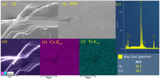 To verify the chemical composition of the as-grown single crystal, the EDS spectrum is taken on a fairly large cleaved surface area, as shown in Figure 3. The second electron image and back-scattering electron image of the same area are shown in Figure 3a,b, with an applied accelerating voltage of 18 kV. A clear layered structure can be observed in Figure 3a, in which the highlighted lines indicate the edge of the layers, and the shadowing effect can be observed next to the highlighted region. Secondary electron (SE) imaging is carried out using the surface morphology sensitive technique, and therefore shows the details of the cleaving steps. At the same area, the back-scattering electron (BSE) image shows much lower contrast, which is due to the much deeper detecting depth in back-scattering mode. Note that the BSE mode is very sensitive to crystal orientation, chemical composition, and impurity phase. The similar feature with lower contrast in the BSE images implies that the cleaved surface of CoTe2 is from a single-crystalline phase without impurities within the resolution. In the EDS measurements, the detection is deeper than the BSE mode, and therefore it is nearly featureless in Figure 3e,f, which show the Co Kα1 and Te Kα1 mapping, respectively. The quantified analysis of the EDS spectrum on the whole surface area is shown in Figure 3c, in which the Co:Te atomic ratio of 36.1:63.9 (close to CoTe1.77) is confirmed. In a previous study, the stabilized layered structure was reported in a Te vacancy phase (CoTe1.8) [49], which supports the finding in our CVT-grown layered CoTe2. The reason for the off-stoichiometric ratio is possibly due to the deviation from a standard CdI2 structure, in which the metal–metal bonding and interlayer covalent interactions are detected [49]. This is quite unusual for a traditional layered compound.