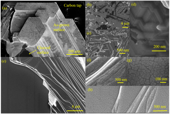 The low-voltage SE images of CoTe2 single crystals. (a) Low-magnification SE image in a large area. The high magnification SE images of as-grown surface and cleaved surface are shown in Panels (b–d) and (e–h).