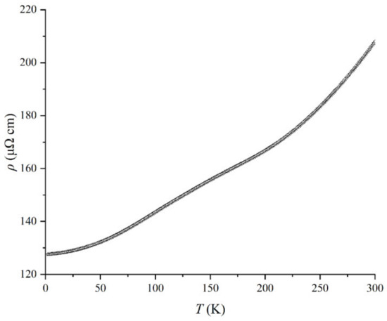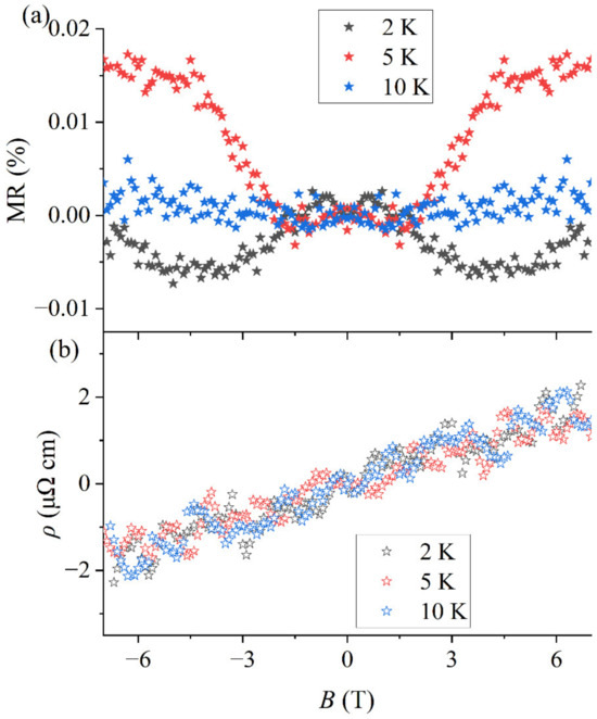 We then study the electronic transport properties of the CoTe2 single crystals with nanoscale features using Hall-bar geometry patterned on a freshly cleaved crystal surface. During the measurements, the current was applied in the c plane, and the magnetic field was applied along the c axis of the crystal. Temperature (RT)- and magnetic field (MR)-dependent longitudinal resistivity are measured using the electronic transport function in PPMS, as shown in Figure 5 and Figure 6. The resistivity is ~205 µΩ cm at room temperature, and decreases monotonically with cooling to 2 K, yielding a residual resistivity ratio of ~1.6. The longitudinal room temperature resistivity is ~180 µΩ cm in a four-terminal measurement [65] in orthorhombic CoTe2, and ~2.5–42 mΩ cm in two-terminal measurements in trigonal CoTe2 nanoflakes [55]. The two terminal results contain contact resistance between CoTe2 and gold contacts, which is significantly higher than the observation here. Moreover, the similar metallic RT behavior was also reported in orthorhombic CoTe2, with comparable resistivity in the 2–300 K region [65]. The other similar compound, NiTe2, however, possesses a much larger RRR value (~109) and lower room temperature resistivity (~26 µΩ cm) [75]. The tellurium vacancy-induced structural change could be a reason for the different transport behaviors between NiTe2 and CoTe2-δ. We then measured the magnetic response of resistivity at low temperatures, as shown in Figure 6a. At 2 K, negative MR behavior is observed, which reaches ~−0.06% at ~4 T. The negative MR vanishes with heating, e.g., at 5 K, a positive MR up to 0.12% is observed. With further heating to 10 K, no obvious MR behavior observed. More low-field features can be observed at 2 K and 5 K, e.g., a slight upturn with magnetic fields applied from 0 to 0.5 T at 2 K, and a slightly negative MR observed at 5 K within 1 T, indicating the complicated magnetic interaction nature below 10 K in trigonal CoTe2-δ.