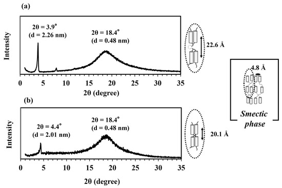 - Tanaka, S.; Hojo, F.; Takezawa, Y.; Kanie, K.; Muramatsu, A. Homeotropically aligned monodomain-like smectic-A structure in liquid crystalline epoxy films: Analysis of the local ordering structure by microbeam small-angle X-ray scattering. ACS Omega 2018, 3, 3562–3570. [Google Scholar] [CrossRef] [PubMed]