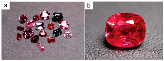 Gem-quality spinel (Figure 1) is a kind of precious stone with a long history. In ancient societies, the red gem-quality spinel was confused with ruby for a long time. With the gradual depletion of ruby mineral resources, gem-quality spinel has attracted increased attention from researchers and consumers [1].