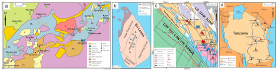 General tectonic map of spinel areas: (a) geological map of Mogok in Burma with the locations of the main gem deposits (modified from Themelis, 2008); (b) mining area in Sri Lanka; (c) map of the main tectonic domain of the Red River shear zone in Luc Yen, Vietnam (modified from Garnier 2003); (d) mining area in southern Tanzania.