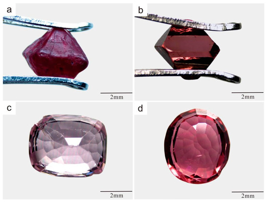 Some photos of the spinel samples. (a) Burmese red spinel B-14; (b) Vietnamese orange spinel V-6; (c) Sri Lankan purple spinel S-5; (d) Tanzanian pink sample T-1.