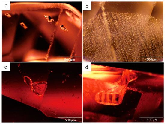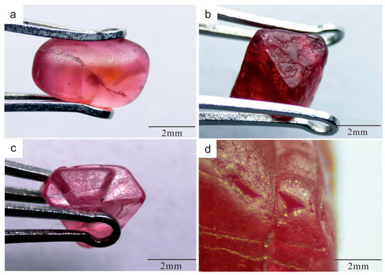 Burmese spinel B-13 has a long crack on the accessible surface (Figure 5a). B-14 is an octahedral crystal with partially damaged and unsharp edges, with many clear etching marks and irregular growth patterns on the surface (Figure 5b). B-3 has a raised triangular growing base on the surface (Figure 5c). B-16 has a triangular etching on the surface (Figure 5d). Spinel from other areas do not have very obvious surface characteristics.