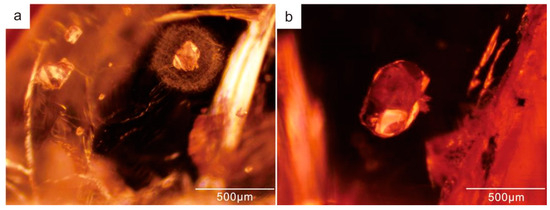 Scattered octahedral crystal inclusions of different sizes are found in Burmese spinel B-3. The clear octahedral outline (Figure 6a) and colorless transparent short columnar inclusion with relatively complete crystal shape and clear edges (Figure 6b) can be seen.