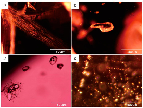 The presence of dislocation systems is the most striking inclusion feature of spinels from Luc Yen [32,49]. These dislocation systems appear as intersecting bands of iridescent parallel-oriented channels (Figure 7a) in Vietnamese spinel V-2. A colorless transparent columnar crystal shaped like a “finger” is also found in V-3 (Figure 7b). Many round gas–liquid inclusions and round crystals are found in V-5 (Figure 7c). Long beaded inclusions are found in V-7 and V-8, which are composed of gas–liquid and crystal inclusions (Figure 7d). Stress cracks around the crystals can also be seen.