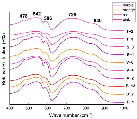 Gem species can be identified according to the characteristic absorption peaks of Fourier transform infrared spectrum. Although the basic characteristics of the infrared spectrum of gem-quality spinels have been studied, many uncertainties still remain about the attribution of its peak position [26]. The mid-infrared region of 400–2000 cm−1 was selected in this study. Since natural spinels have no characteristic absorption peaks in the range of 1000–2000 cm−1, only absorption peaks in the range of 400–1000 cm−1 are discussed.