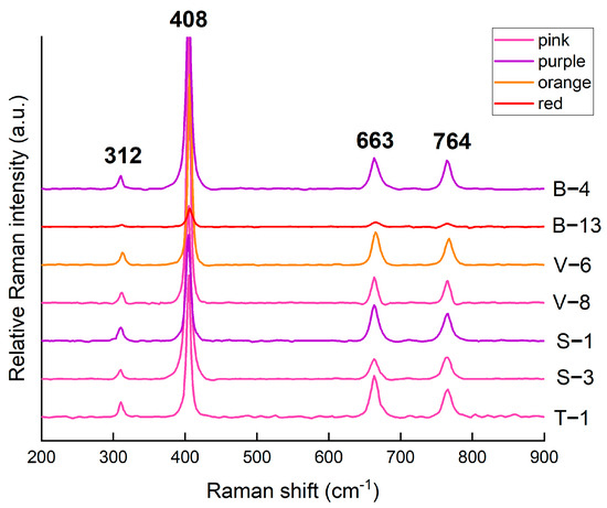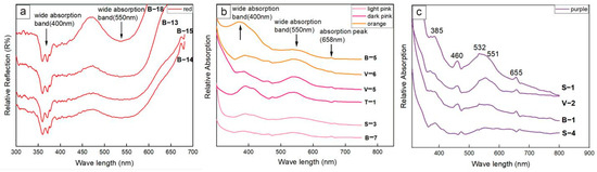 The slightly different positions of 400 nm absorption band shown in Figure 10a,b may be because the red color of the red samples is darker than that of the pink and orange samples or because the transparency of the red samples is poor. The absorption intensity of V-8, V-5, and T-1 is stronger than that of S-5, S-3, and B-7, possibly due to their different pink tones. V-8, V-5, and T-1 are pink with reddish tones and darker than S-5, S-3, and B-7, which are also distinguished by the curves of one dark pink and the other light pink shown in Figure 10b.