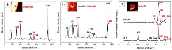 Two octahedral crystal inclusions in Burmese spinel B-3 (Figure 6a) were selected for Raman analysis (Figure 12). Figure 12a shows not only the absorption peaks of spinel at 407 cm−1, 665 cm−1 and 762 cm−1 but also four dolomite absorption peaks of 177 cm−1, 302 cm−1, 719 cm−1, and 1096 cm−1 in the smaller octahedral crystal inclusion in B-3. Therefore, it can be known that the smaller octahedral inclusion of B-3 is composed of dolomite (Zaw, 2017). Figure 12b shows not only the absorption peaks of spinel at 407 cm−1, 663 cm−1, and 762 cm−1 but also the dolomite absorption peaks of 177 cm−1, 302 cm−1, and 1098 cm−1 as well as the calcite absorption peaks of 153 cm−1, 280 cm−1, 711 cm−1, and 1084 cm−1 in the bigger octahedral crystal inclusion in B-3. Therefore, the bigger octahedral crystal inclusion of B-3 is composed of a mixture of calcite and dolomite [30]. This result is consistent with the conclusion obtained by Gübelin et al., who proposed that the crystal part with clear octahedral inclusions is dolomite, while the one with linear distribution near the crystal is calcite by EPMA [7].