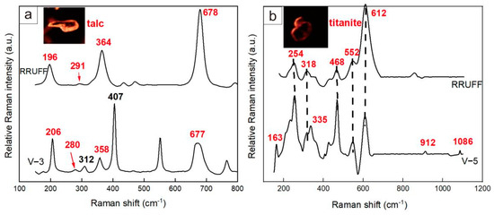 Raman spectrum of inclusions from Vietnamese spinel: (a) Raman spectrum of talc in V-3; (b) Raman spectrum of titanite in V-5.