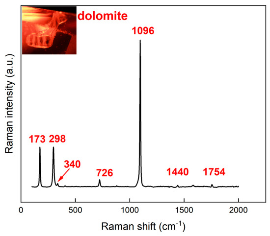 The “boot” crystal in Tanzanian spinel T-2 (Figure 8d) analysis was selected for Raman analysis (Figure 15). As shown in Figure 15, T-2 has absorption peaks of 173 cm−1, 298 cm−1, 340 cm−1, 726 cm−1, 1096 cm−1, 1440 cm−1, and 1754 cm−1, representing dolomite. Therefore, the colorless and transparent part of the “boot” crystal in T-2 is dolomite, but the specific cause of the white stripe part is not known. The two crystals shown in Figure 7c are also identified as dolomite (A7) by Raman analysis.
