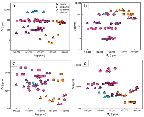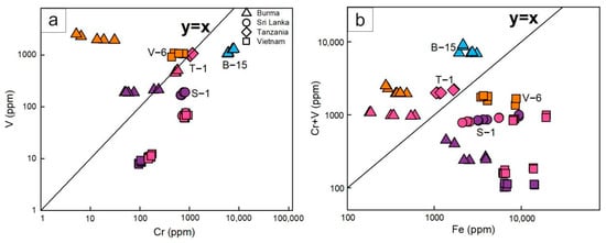 The elements V, Cr, Fe, and Zn are commonly present in highest concentrations, whereas concentrations of Ti, Mn, and Li are generally low. Traces of Be, Co, Ni, and Cu are detected, and other investigated elements are below the detection limits (Table 3). Burmese spinel has high Cr content (up to 7387 ppm) and high Ti content (up to 497 ppm). The investigated samples from Vietnam stand out by having the highest Fe content (3669.63–19,425 ppm), as well as low Ti concentrations (<89 ppm). Mn content is high in Sri Lankan spinels (192.88–659.7 ppm). The contents of Ti, Mn, and Li in the sample from Tanzania are very low. Samples from Tanzania show the lowest values for Ti (20.02–29.03 ppm), Mn (9.95–14.3 ppm), and Li (17.46–31.61 ppm). The Co content is very low, ranging from 0.074 to 13.01 ppm, which basically fails to reach the color limit of 10 ppm and is generally not the main reason for spinel to produce blue and purple tones [17]. Mn and Ti do not play a decisive role in the formation of color in spinel.