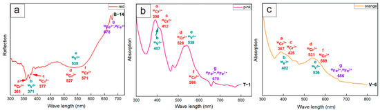The results of trace element analysis show that the Cr content in the red sample B-15 is higher than that of V. Therefore, the absorption bands of a, c, d, and f caused by Cr3+ are more dominant than those of b and e caused by V3+ (Figure 18a), making the blue-violet and yellow-green light in visible light more absorbed and pass through more red light. As a result, spinels appear red.