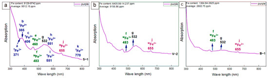 A total of 11 relatively fixed absorption bands (a–k) appear in the range of 300–800 nm, indicating that the spin-forbidden transition of Fe3+ and Fe2+ is the main reason for the purple color of spinels. As shown in Figure 19 and Figure 10c, purple spinel has a wide absorption band centered at 550 nm in the yellow-green zone, a 385-nm absorption band in the purple zone, a 460-nm absorption band in the blue zone, and a 655-nm absorption band in the red zone. The absorption intensity of the 551-nm absorption band h of each sample is the strongest, playing a dominant role in purple spinels. The 551-nm absorption band is caused by the spin-forbidden transition 5E(D)→3T2(H) [56,57]. The absorption intensity of the absorption bands f (483 nm) and g (532 nm) is positively correlated with the Fe content [62]. The average Fe content of spinel S-1, V-2, and B-1 is 9512.15 ppm, 9156.86 ppm, and 2602.75 ppm, respectively. Therefore, the absorption intensity of the absorption bands f and g of S-1 are the highest, followed by V-2 and B-1 (Figure 19). The absorption intensity of the 655-nm absorption band j also increases with the increase in Fe content, which is mainly caused by FeTot, followed by Fe3+ [57]. At the 300–330-nm wavelength, the purple and blue light in visible light are strongly absorbed due to the charge transition of O2−→Fe2+ and O2−→Fe3+, showing strong UV edge absorption. The UV edge absorption bands a (371 nm), b (385 nm), and c (406 nm) caused by the spin-forbidden transition of TFe2+ appear in almost all purple spinels, and their positions are basically the same. As presented in Table 5, the purple color of spinels from Burma, Vietnam, and Sri Lanka is caused by Fe2+ and Fe3+, and no absorption peak d is caused by Mn2+.