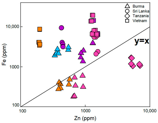Burmese red spinel is rich in Cr, while Vietnamese orange spinel is rich in V. The comparison of Zn and Fe contents reflects two chemical element trends, namely, zinc-rich spinel and iron-rich spinel. Fe-rich spinel is distributed along the vertical axis, while Zn-rich spinel is distributed along the horizontal axis (Figure 20). The Fe content of Vietnamese spinel is generally high (3669.63–19,425 ppm), the Zn content of Tanzanian spinel is high (5129.96–7008 ppm), and the Fe and Zn contents of Burmese spinel are low (Fe: 135.68–3925 ppm, Zn: 338.58–1312 ppm). Zn-rich spinels require a Zn content above 3000 ppm [4]. The results show that Tanzanian pink spinels belong to Zn-rich spinels.