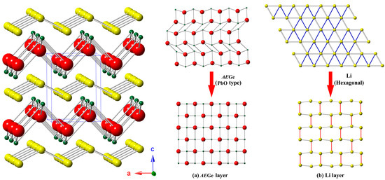 Schematic representation of AELi2Ge, viewed approximately along the crystallographic b-axis and the projection of the crystal structure of AELi2Ge on the (001) planes: (a) AEGe layer and (b) Li layer. AE atoms are represented as blue spheres, Ge atoms are drawn as green spheres and Li atoms are shown with the red spheres. Both layers can be considered as the distortion of the corresponding simple compounds: (a) PbO-type AEGe and (b) hexagonal Li.