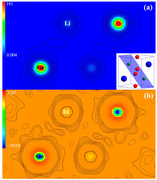 Electron density distributions obtained by MEM (a) and its Laplacian transformation (b). The inset crystallographic structure in (a) shows the crystal planes containing only Ge (green spheres) and Li (red spheres) atoms, corresponding to the electron density distributions. The unit for the electronic density is e/Å3. The logarithmic contour lines show eight levels, from minimum to maximum.