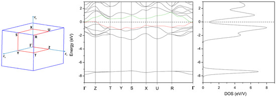 Band structure (middle) and DOS (right) of BaLi2Ge, together with the schematically depicted Brillouin zone (left). The Fermi level is shown as the dash line. The red line in the band structure represents the main conductive band.