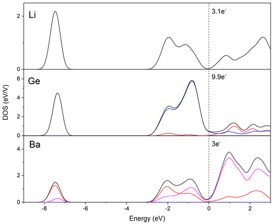 Partial DOS (black lines) for Ba, Li and Ge in BaLi2Ge. Contributions from s-, p-, d-bands are shown by the blue, red and pink lines, respectively. The dotted lines indicate the Fermi level. Around 0.9 electrons are transferred from Li to Ge (in one unit cell with two formula units).