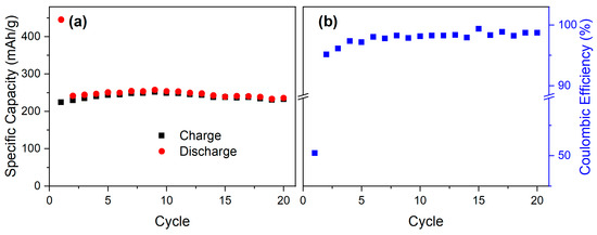 The electrochemical performance of polycrystalline CaGe. Panel (a) shows the specific capacity, and panel (b) depicts the Coulombic efficiency.