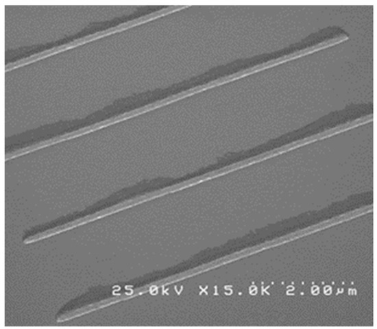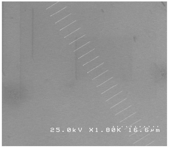 Scanning electron microscopy (SEM) images of the obtained nanostructures were collected. The first set of deposited wires, with a real thickness of approximately 200 nm were deposited in a sequence of exposure doses ranging from 0.6 μC/cm2 up to 0.79 μC/cm2. The SEM image presented in Figure 2 exhibits these traits, wherein the doses increase from the top of the image to the bottom.