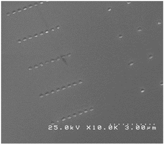We have obtained regular shapes of circles and triangles with exposed characteristic dimensions of 200 nm and 400 nm in the case of test 1. The area of the shapes was enlarged by almost 80% with respect to the exposed area after performing reactive ion etching (test 1), but the shape of the structures remained relatively identical to the exposed shape. The best results obtained within test 1 were achieved for a current of 15 pA, with the corresponding SEM images shown in Figure 3, Figure 4 and Figure 5.