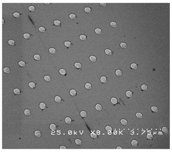 In fact, it is observed that the measured sample has magnetic coercive fields between 0.45 and 0.8 T, equivalent to 4.5 and 8 kOe, respectively, measured at 300 K and 5 K respectively. For the calculation of the magnetic coercive field, we assumed the sample geometry as being that observed in the SEM images, such as in Figure 6, with a total assumed thickness close to the nominal 70 nm. For calculation of the filling factor, we assumed a regular array, as per that in Figure 7, where the dots are of 335 nm diameter and are spaced by 1200 nm in each direction. Taking into account the size of the image and the number of dots per image we have calculated a filling factor of about 12.7%. Taken into account this factor we have thus calculated the saturation magnetization for each of the FePt dot to be about 8.82 emu/cm2. The remanent magnetization values are high, namely 5.98 emu/cm2 (5.43 emu/cm2 at 300 K), comparable to those of L10 FePt bulk alloys. The spin magnetic moment at the Fe sites is calculated from the experimental data to be µS = (2.37 ± 0.13) µB at 300 K for the sample @0.79 μC/cm2. It is important to notice that, in the investigated array of FePt circles, the microstructure consists of only the tetragonal L10 phase, and that this microstructure is well reflected in the overall magnetic behavior. The saturation magnetization is also proven to be high, which is a good prerequisite for obtaining an elevated maximum energy product which is the Figure of Merit for any nanomagnetic structure, albeit nanoparticle, thin film or engraved dots and circles. These findings are encouraging, as they show potential for developing regular arrays of uniformly shaped magnetic entities with good magnetic performances in view of potential and various applications, from biomagnetic sensing through the magnetoresistance effect up to THz spintronic devices for telecom applications and heating dot magnetic recording.