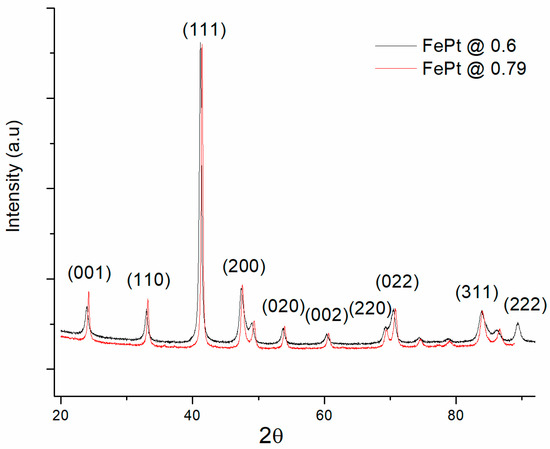 In Figure 8, which depicts the XRD patterns corresponding to the samples exposed at 0.6 μC/cm2 and at 0.79 μC/cm2 all the main Bragg lines of tetragonal L10 FePt are present in both samples. There is a strong presence of the superlattice peaks, (001) and (110) diffraction lines, as well as the presence of main (111) Bragg lines followed by other superlattice peaks, distinctly split (200) fundamental reflection, recorded at around 48–49 degrees in 2 theta. It should be mentioned that the two main superlattice peaks of tetragonal L10, the (001) and (110) reflections occur for the employed Cu Kα radiation at about 23° and 32°, respectively. It should also be mentioned that the six main Bragg lines of the tetragonal FePt, from lower to higher angles, are, in order, attributed to (001), (110), (111), (200), (020), (002), (220), (022), (311) and (222) hkl planes reflections. The peak assignation has been undertaken in agreement with the ICDD card 03-065-9121. Beyond the occurrence of the superlattice peaks (001) and (110), another distinct signature of the occurrence of the tetragonal L10 phase is the fact that the (200), (220) and (311) peaks are split into two. Such a feature has been encountered in other works on FePt [20,21,22] and has been unambiguously regarded as a further proof of the occurrence of the L10 phase, this being due to the tetragonally distorted planes and giving rise to the spectral splitting observed in these peaks. Upon the fitting of the XRD spectra, we have also derived the average crystallographic grain size of the L10 FePt. It has been thus observed that the average grain size of the tetragonal L10 phase ranges from 20 to 24 nm on increasing the exposure dose. We conclude that in these XRD results, only the L10 phase has been identified. In relation to the previous studies [8,9], where it has been shown that not all of the FePt dots were transformed from a cubic A1 to tetragonal L10 structure, which was detrimental to the magnetic anisotropy, in our case all of the observed dots seem to be in their ordered L10 tetragonal crystal structure.