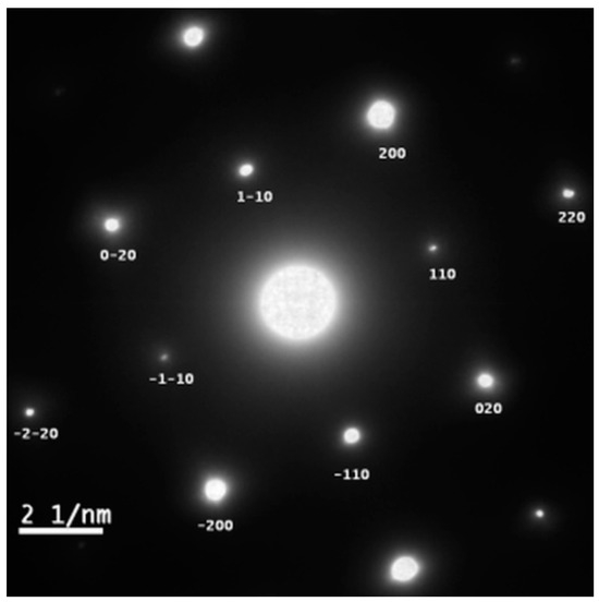 The microstructure of the granular regions on the magnetic dot surfaces, on the sample with circular shapes shown in Figure 7, was imaged with the help of the transmission electron microscopy in the high-resolution mode, coupled with the observation of the electron diffraction patterns, within the imaged areas on the dots surface. In the imaging area the sample was thinned down by ion etching of the substrate with the focused ion beam module of the microscope. A typical magnified image obtained in HRTEM is shown in Figure 9. The high-resolution image, recorded in phase contrast imaging mode, reveals small nanocrystals of ordered tetragonal L10 FePt symmetry. The observed microstructure is apparently made of ordered FePt crystallites, with a size of between approximately 4 and 8 nm, and which are distributed within a wide area between 13 and 18 nm. The reticular interplanar distances, clearly observed and measured on the image, prove the occurrence of the (110) and (1–10) superlattice reflections, which are indeed typical for the tetragonal L10 FePt phase. This confirms, in a more illustrative way, the findings obtained from XRD analysis, detailed above. Another main Bragg reflection of the L10 phase, the (200) reflection is also observed and accurately measured on the image through the measuring of the interplanar distance. Taking into account that the limiting critical size for single-magnetic domains is 55 nm for L10 FePt nanograins [23] it can safely be concluded that the FePt regions are magnetically single domains, irrespective of their crystal symmetry or of their degree of crystallographic ordering. Figure 10 depicts the selected area electron diffraction image corresponding to the area that is imaged in real space in Figure 9. Being essentially a map of the reciprocal space, the SAED image illustrates via the brightness of the observed spots, the intensity of the corresponding planar reflection, thus indicating quantitatively the abundance of the ordered FePt grains. It can be seen that SAED analysis also confirms the occurrence of the ordered L10 FePt phase in the imaged magnetic dot. The presence of the main superlattice spots, the (001) and (110) Bragg reflections of L10 phase, in the SAED patterns, proves the occurrence of both crystallographic orientations, with the tetragonal c-axis perpendicular and parallel to the surface normal. Here, the atomic planes of a (110) nature are seen, which again confirms the occurrence of the superlattice reflections.
