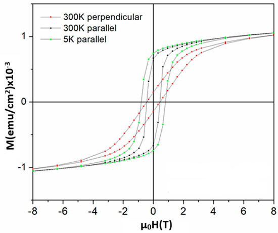 The 300 K and 5 K hysteresis loops of the regular arrays of FePt circles, as seen in Figure 7, recorded in perpendicular and parallel applied magnetic field, with respect to the array plane. The loops correspond to the sample engraved with the maximum exposure rate of 0.79 μC/cm2.