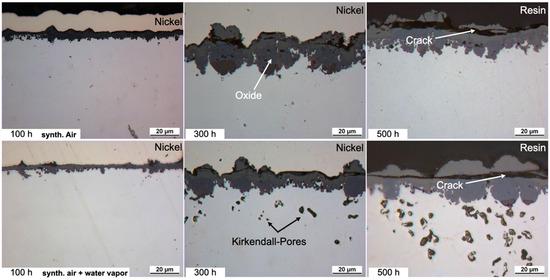 Light microscope images of the cross-sections of HEA+Mn after exposure at 800 °C for 100, 300 and 500 h in dry air and air + 10 vol.% H2O. Dry-air images from [25].